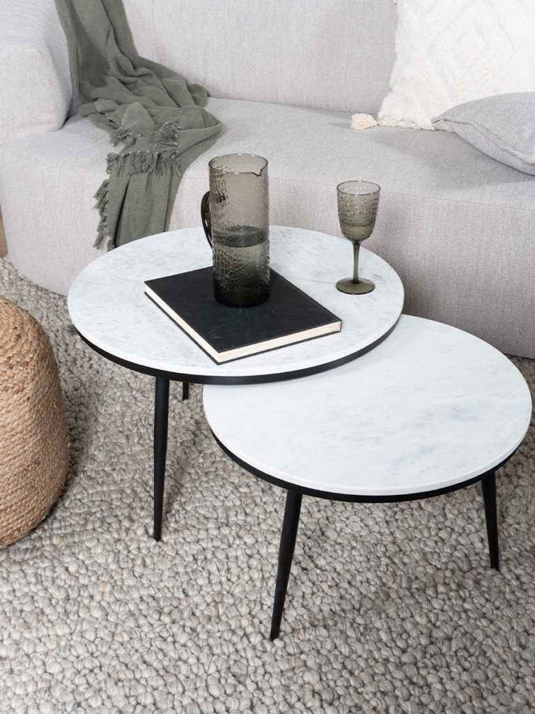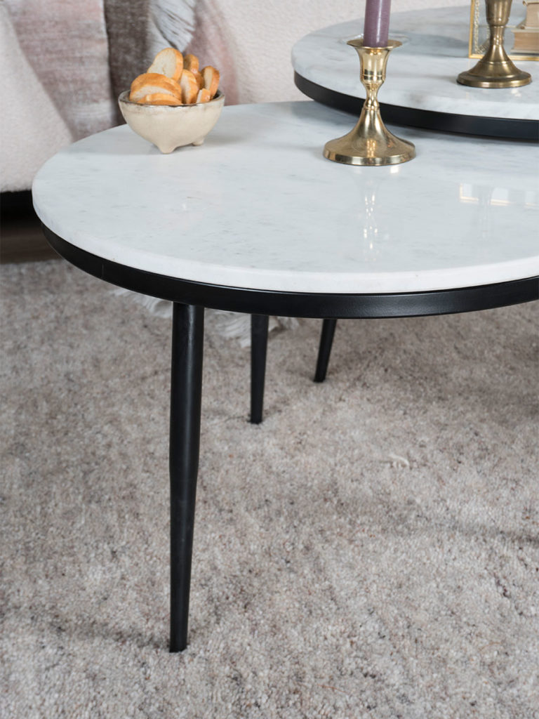 Salontafel Melle zorgt voor een verfijnde sfeer in jouw interieur! Kenmerkend is het witte marmeren blad en de slanke metalen poten. Is het geen pareltje? Met de ronde contouren en stijl, zal deze salontafel goed passen in een klassiek, luxe of modern interieur. Je hoeft er alleen nog maar een paar geurkaarsen op te plaatsen en je bent klaar! ✓ Trendy salontafel ✓ Wit marmer ✓ 3 metalen poten ✓ Ook gaaf als set! ✓ Verkrijgbaar in twee maten