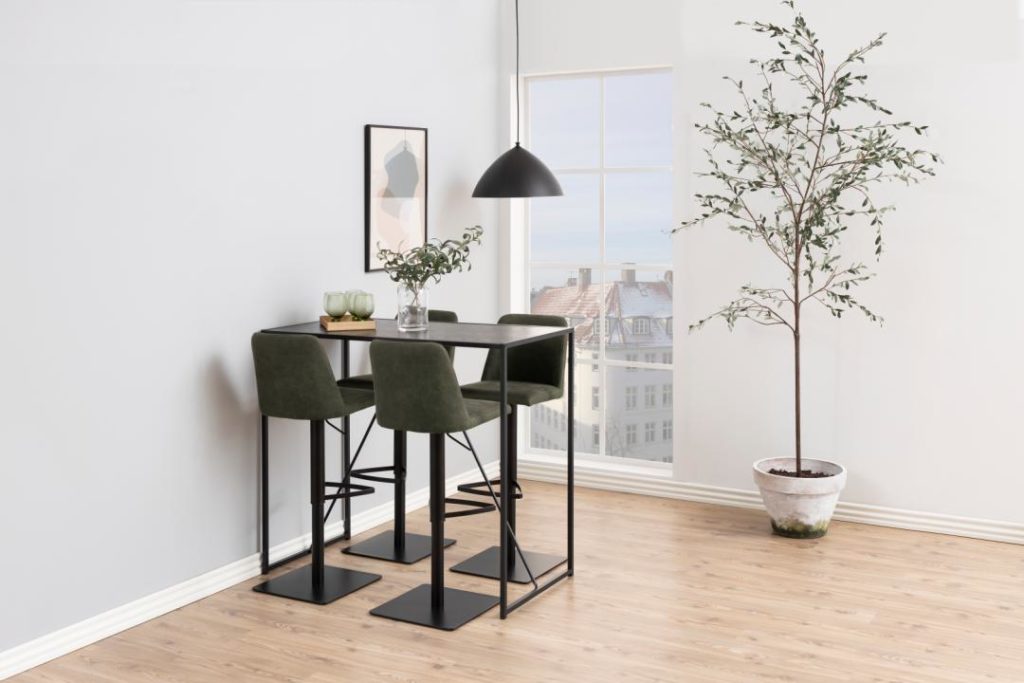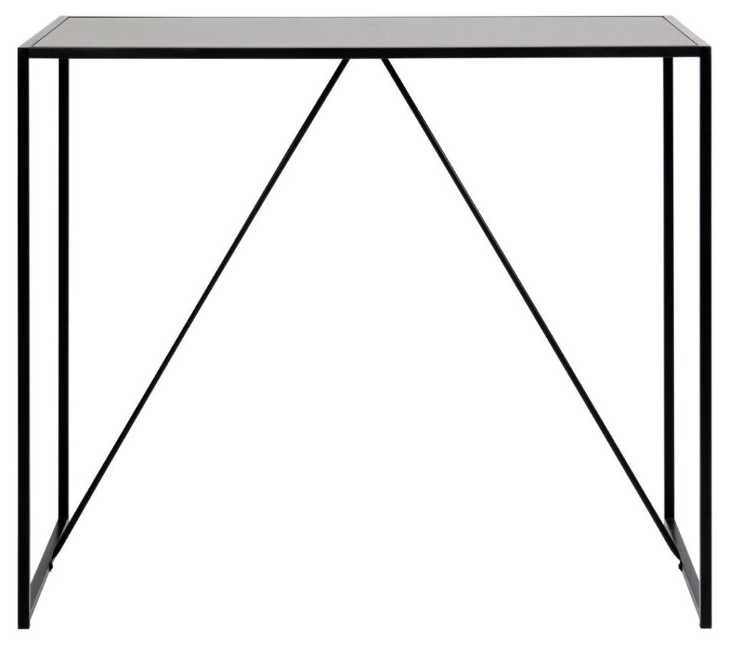 Een exclusieve bar tafel voor een stijlvolle eetkamer. Modern met een industriële twist door de metalen basis en zwart as melamine tafelblad. Met voetsteun, makkelijk te monteren en perfect voor de meeste woningen.