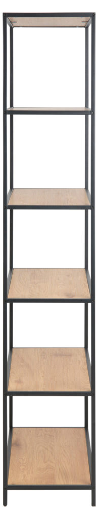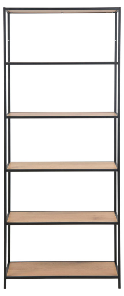 Sierlijk Seaford boekenkast met matzwart stalen frame, 5 wild eikenhouten planken en een robuuste uitstraling. Afmetingen 77x35x185 cm.