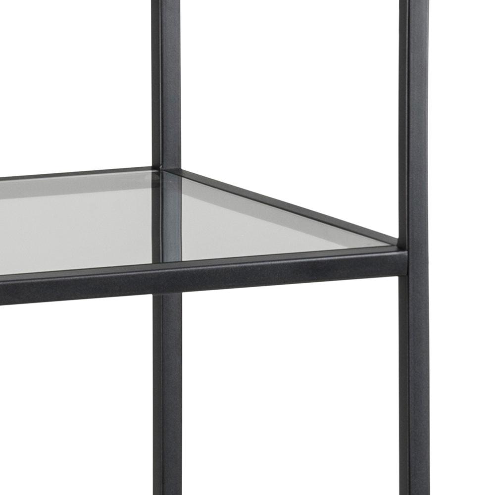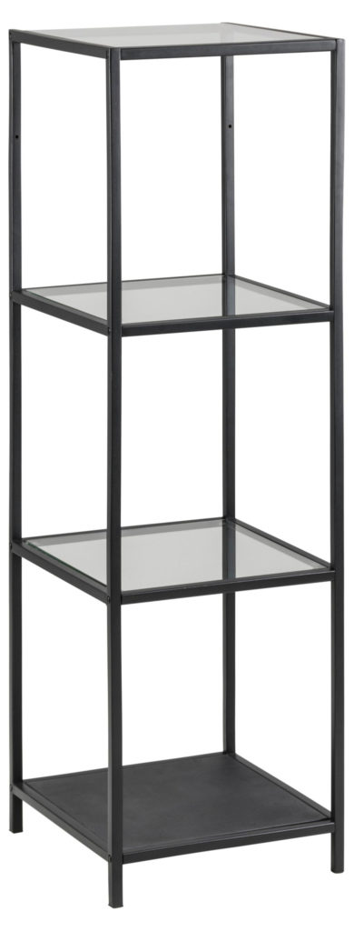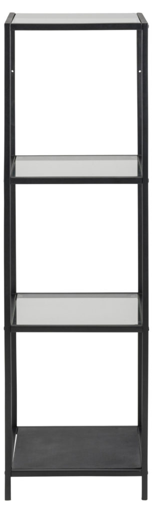 Seaford boekenkast, frame en basis van mat zwart ruw gepoedercoat staal, 3 planken van helder gehard glas en zwart gehard en geëtst glas, 35x37x119.5 cm