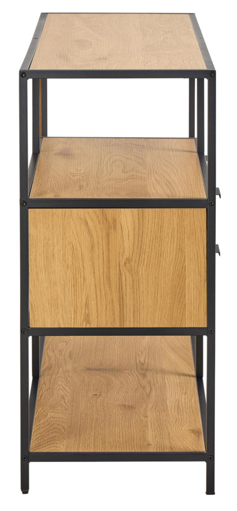 Voeg stijl toe met de Seaford boekenkast in mat zwart ruw gepoedercoat staal. Met 2 laden, 3 planken in mat wild eiken ruw melamine, omkeerbaar achterpaneel en uniek asymmetrisch detail. Afmetingen: 114x35x78 cm.
