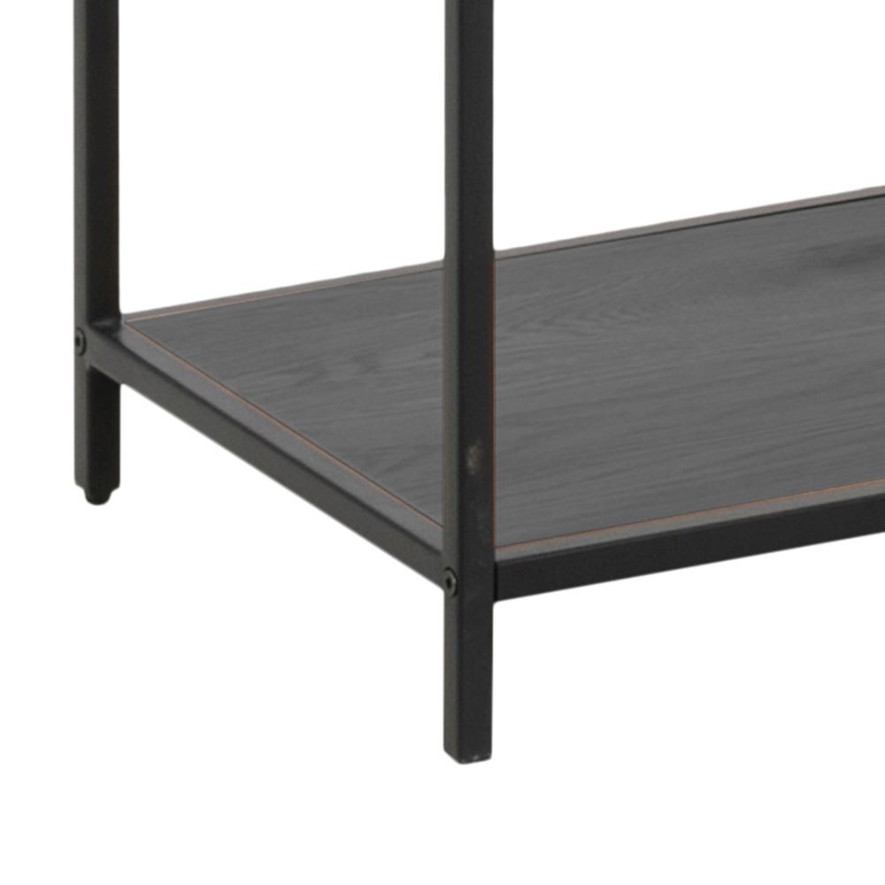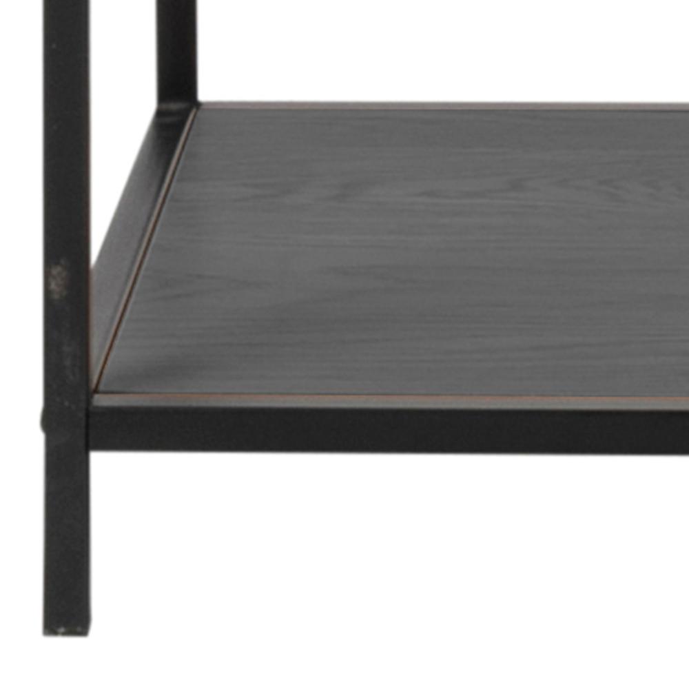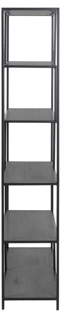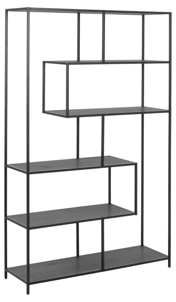 Stijlvolle, industriële boekenkast Seaford — matzwart, ruw gepoedercoat stalen frame en voet, vijf zwarte essenplanken in robuuste melamine met subtiel asymmetrisch detail. Strak design, duurzaam. Afmetingen: 114 × 35 × 185 cm.