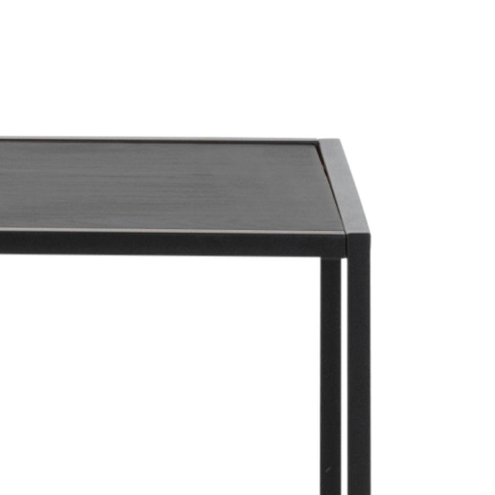 Smalle details, groot effect: moderne boekenkast met vijf asymmetrische planken in zwart essen op een mat-zwart, ruw gepoedercoat stalen frame. Strak, duurzaam en eenvoudig te monteren — verfijnt elke ruimte en benadrukt jouw mooiste objecten.