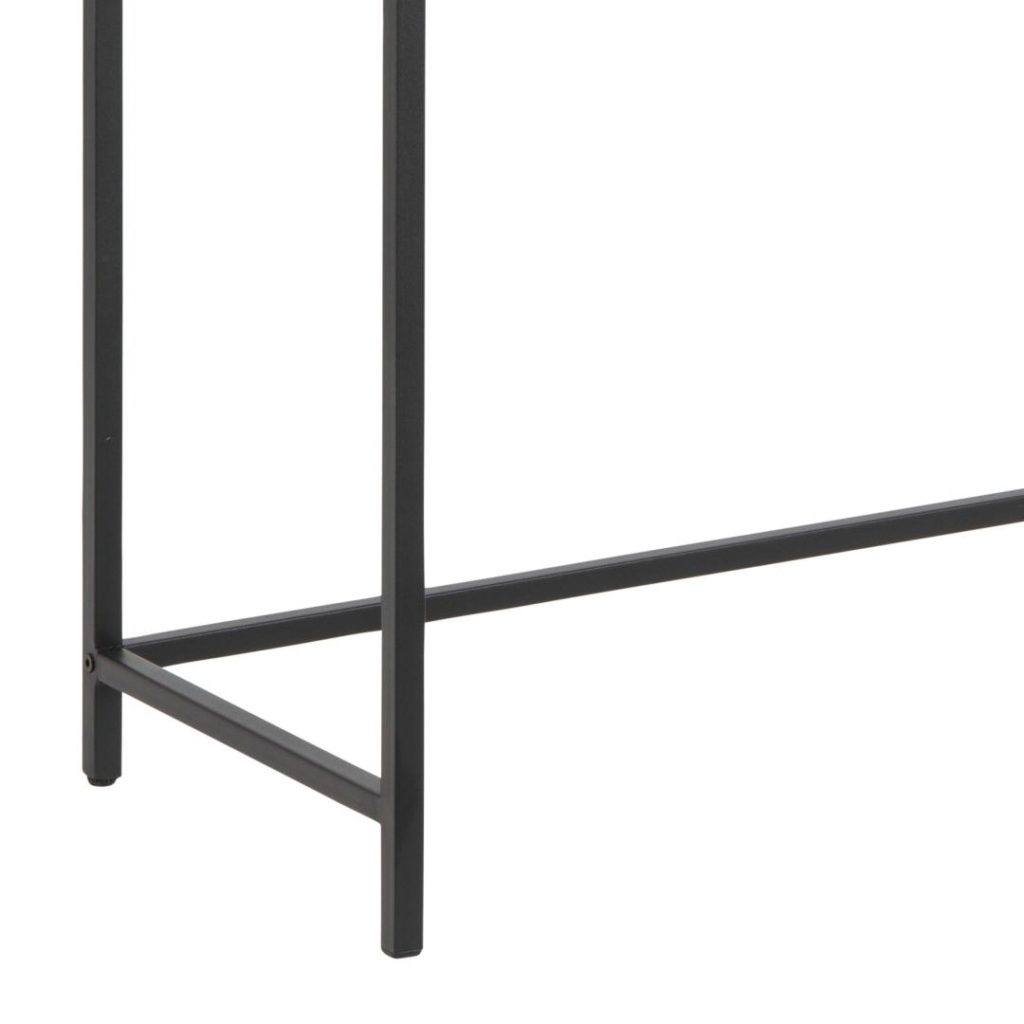 Verfraai je ruimte met deze veelzijdige consoletafel, ideaal voor stijl en opslag. Het zwarte poeder gecoate metalen frame geeft een industriële touch, terwijl het tafelblad en de onderste plank zorgen voor praktisch gebruiksgemak. Perfect voor elke interieurstijl in de gang of woonkamer.
