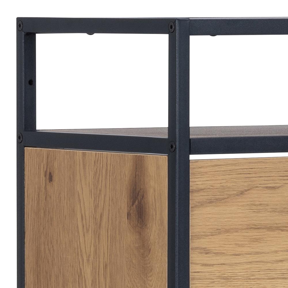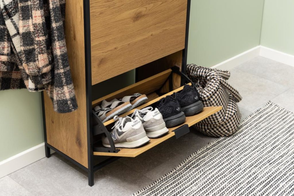 Houd de gang georganiseerd met dit moderne schoenenkastje in zwart staal en wild eikenlook. Drie compartimenten houden je schoenen netjes. Inclusief open compartiment, eenvoudige demontage-assemblage.