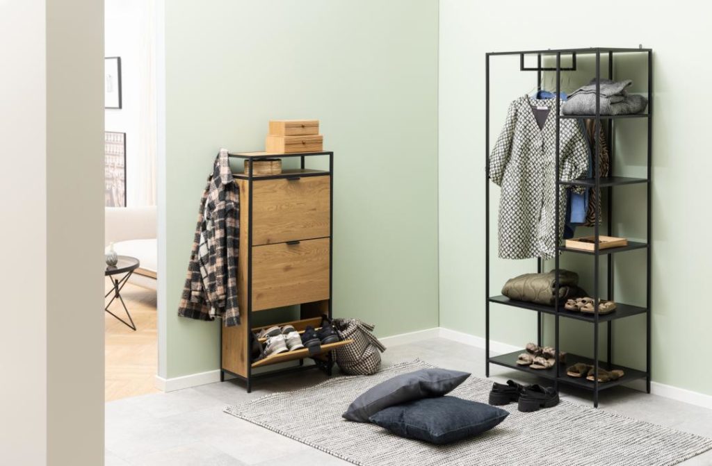 Stijlvolle Seaford schoenenkast van zwart gepoedercoat staal met 3 eiken laden en een open compartiment. Afmetingen: 56x30x129 cm. Perfect om op een stijlvolle manier je schoenen te organiseren.