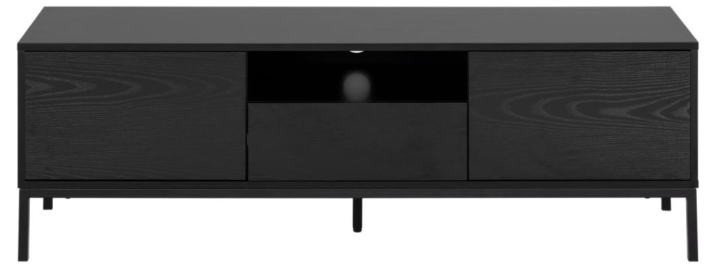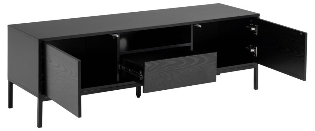 Elegante Seaford TV-meubel met matzwarte details, push-to-open functie, en soft close mechanisme. Gemaakt van hoogwaardige materialen zoals MDF en poeder gecoat staal. Praktisch en stijlvol met 2 deuren, lade, en draadgat. Afmetingen 140x40x45 cm.