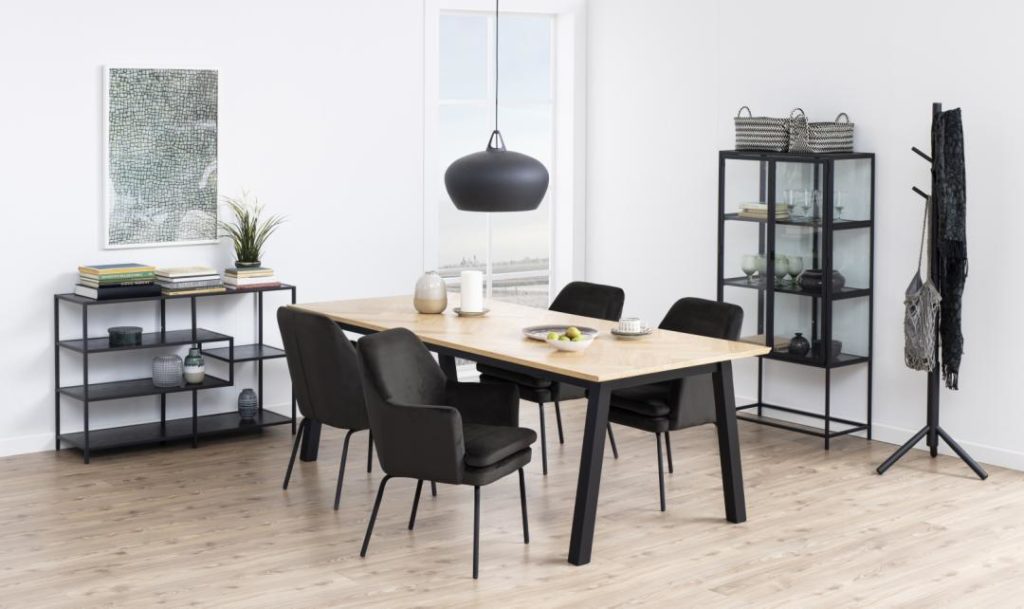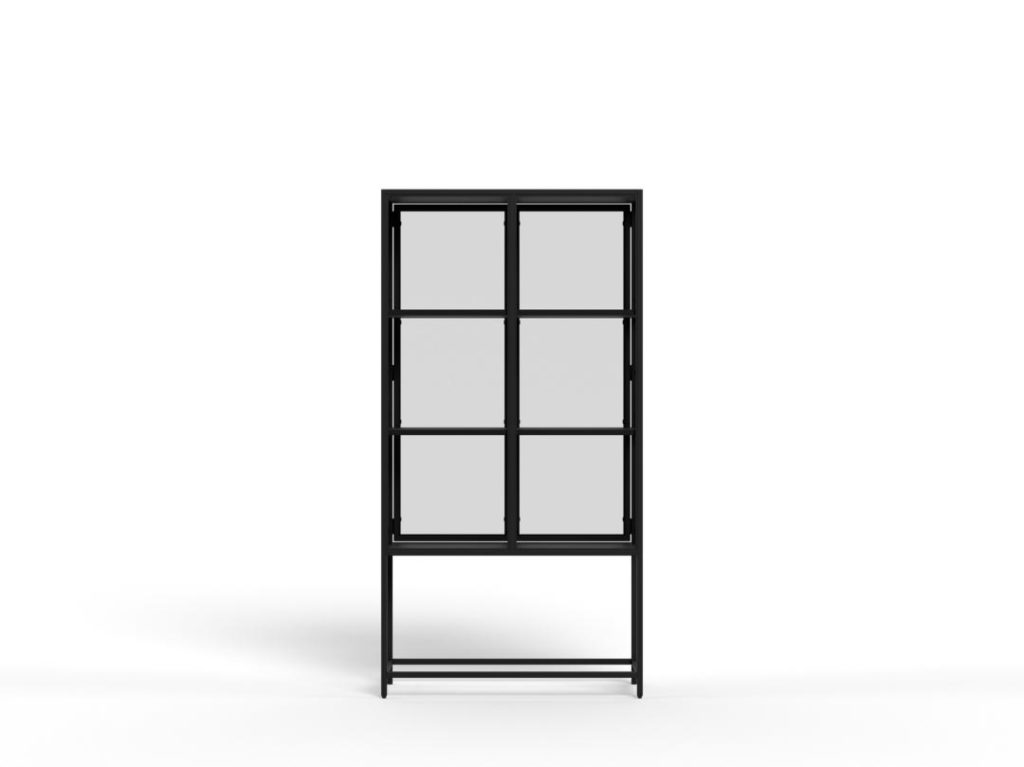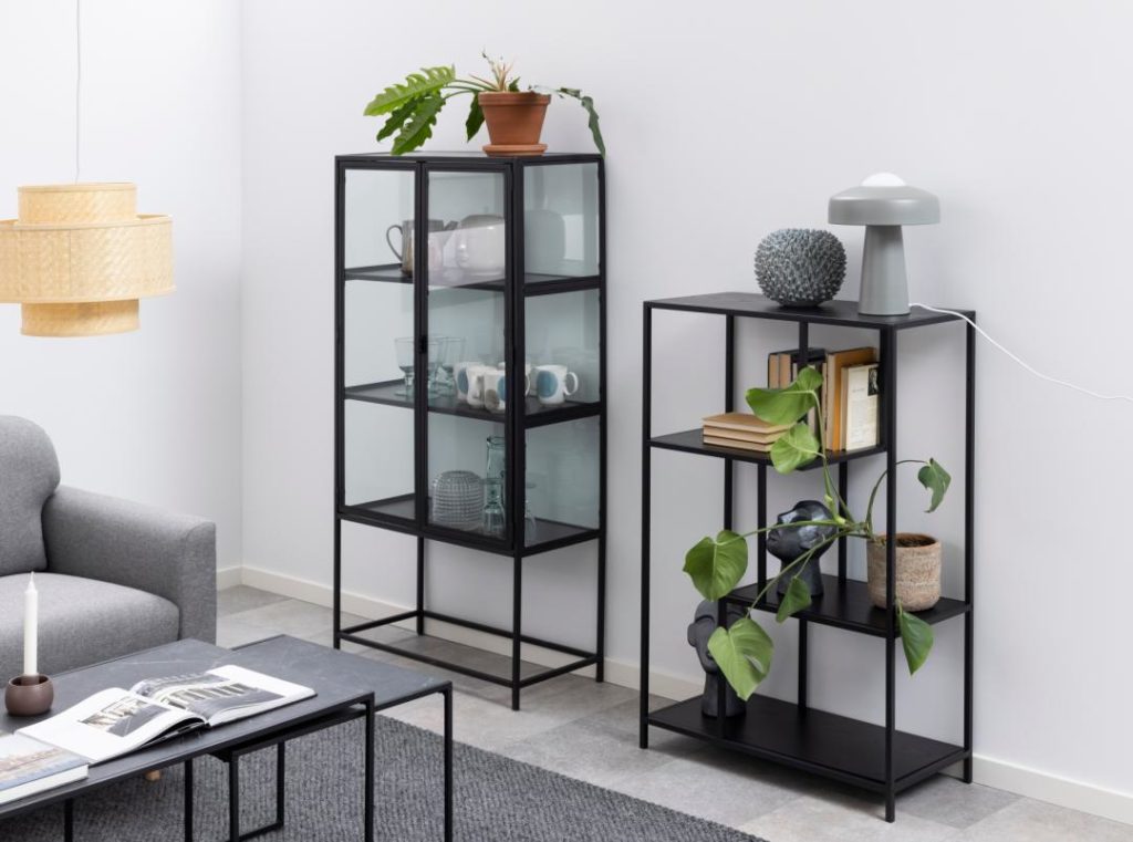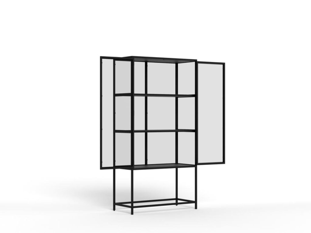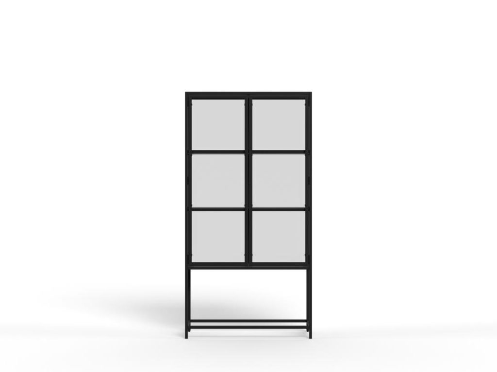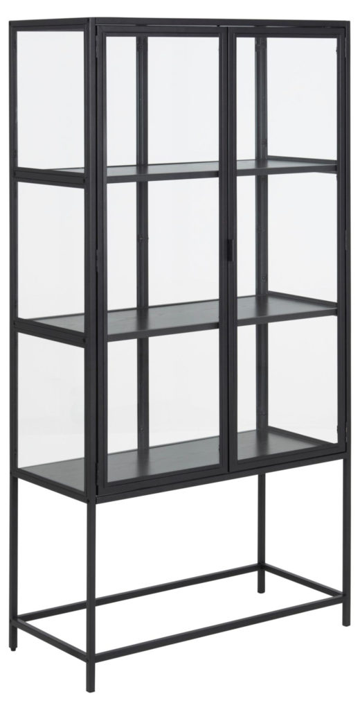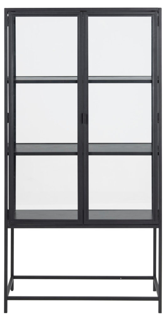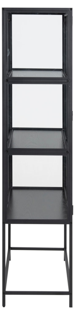 Modern Seaford vitrinekast met stalen frame in matzwart, eikenhouten planken in donkerzwart, glazen deuren, en ruwe afwerking. Maat: 77x35x150 cm.