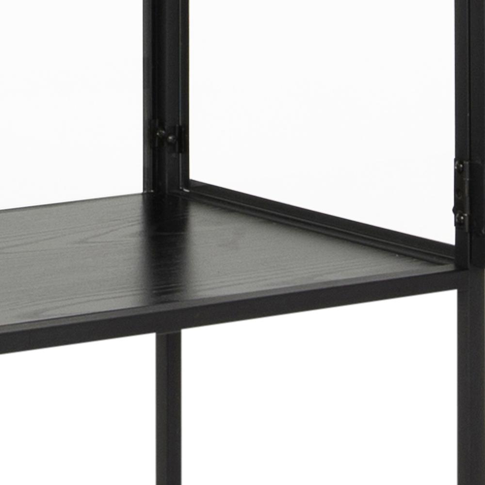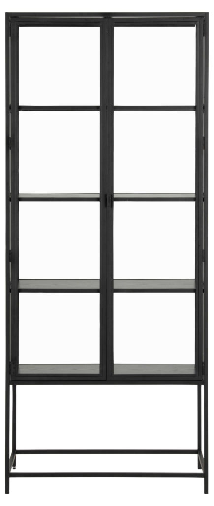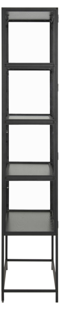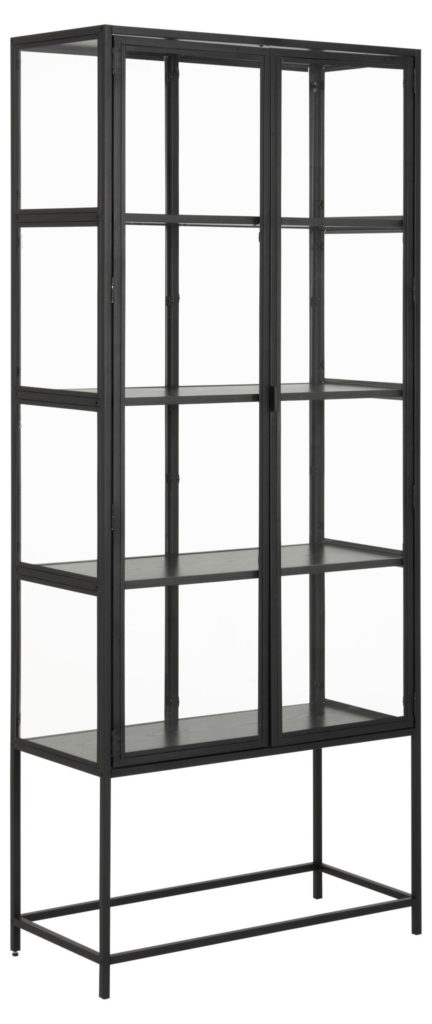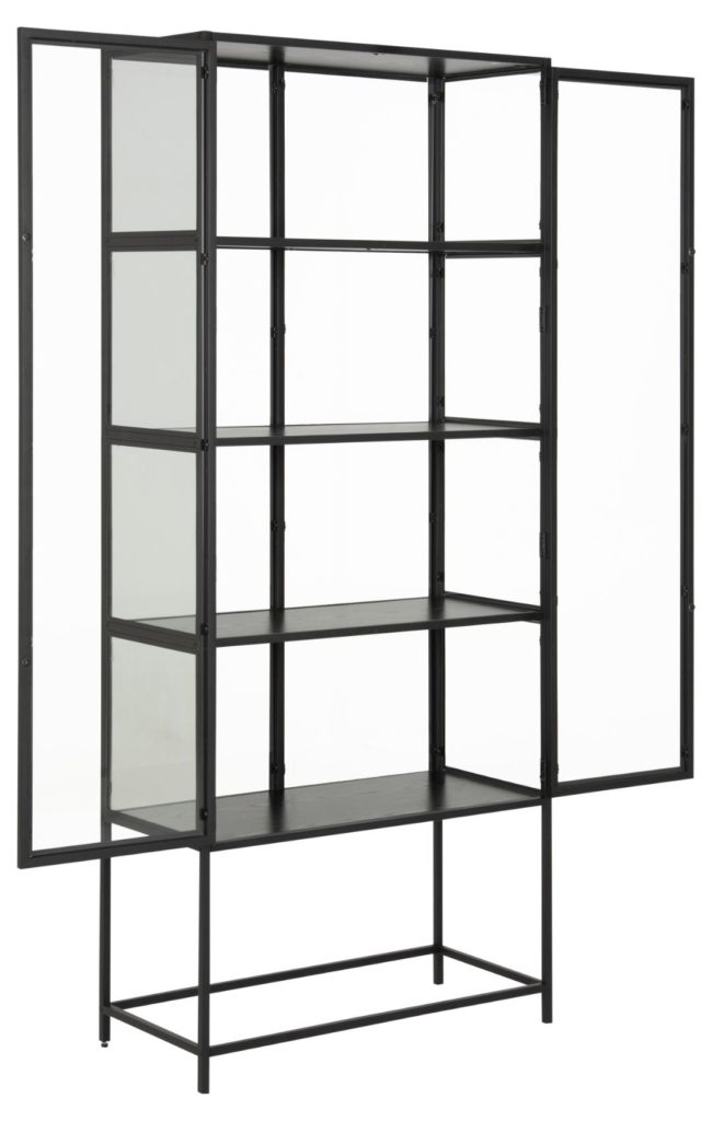 Elegant toon uw items in de Seaford vitrinekast. Het matzwarte stalen frame en onderstel, aszwarte melamine planken en gehard glazen deuren zorgen voor een verfijnde uitstraling. Afmetingen: 77x35x185.6 cm.