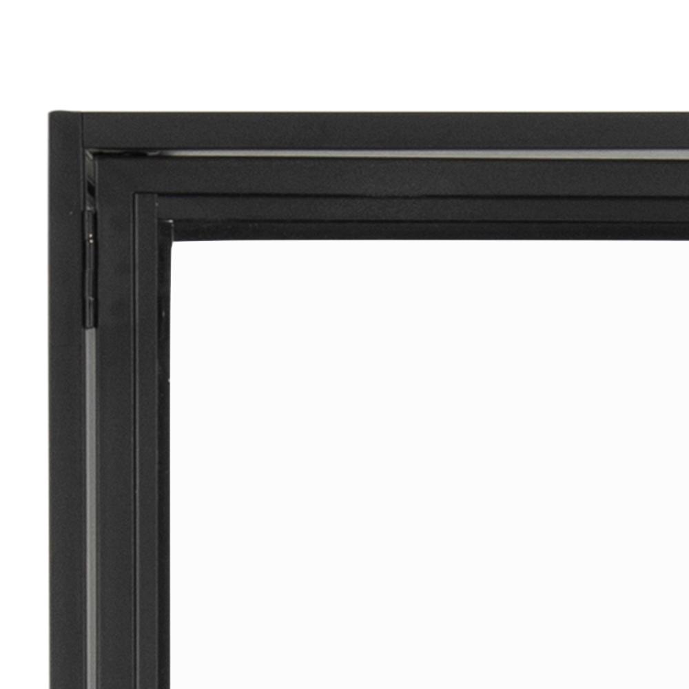 Creëer een stijlvolle ruimte met deze veelzijdige glazen kast. Dit industriële stuk in zwart gepoedercoat metaal heeft vier planken achter glazen deuren voor opslag. Ideaal voor keuken of woonkamer.