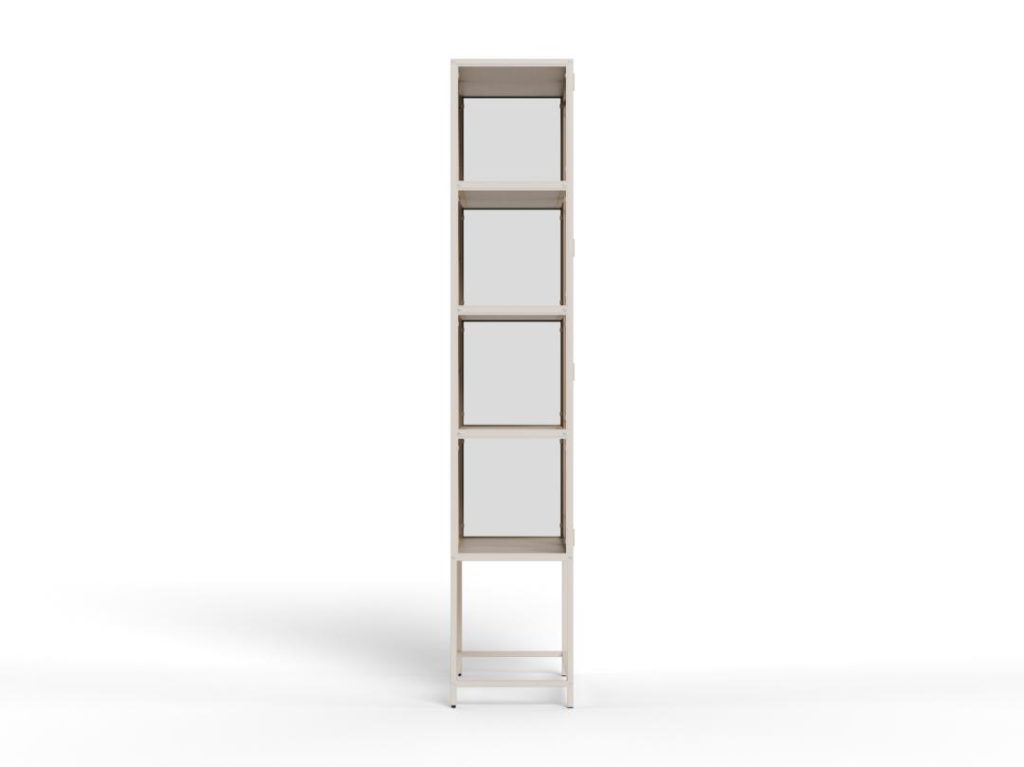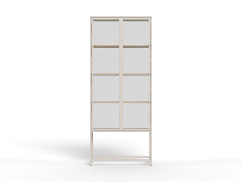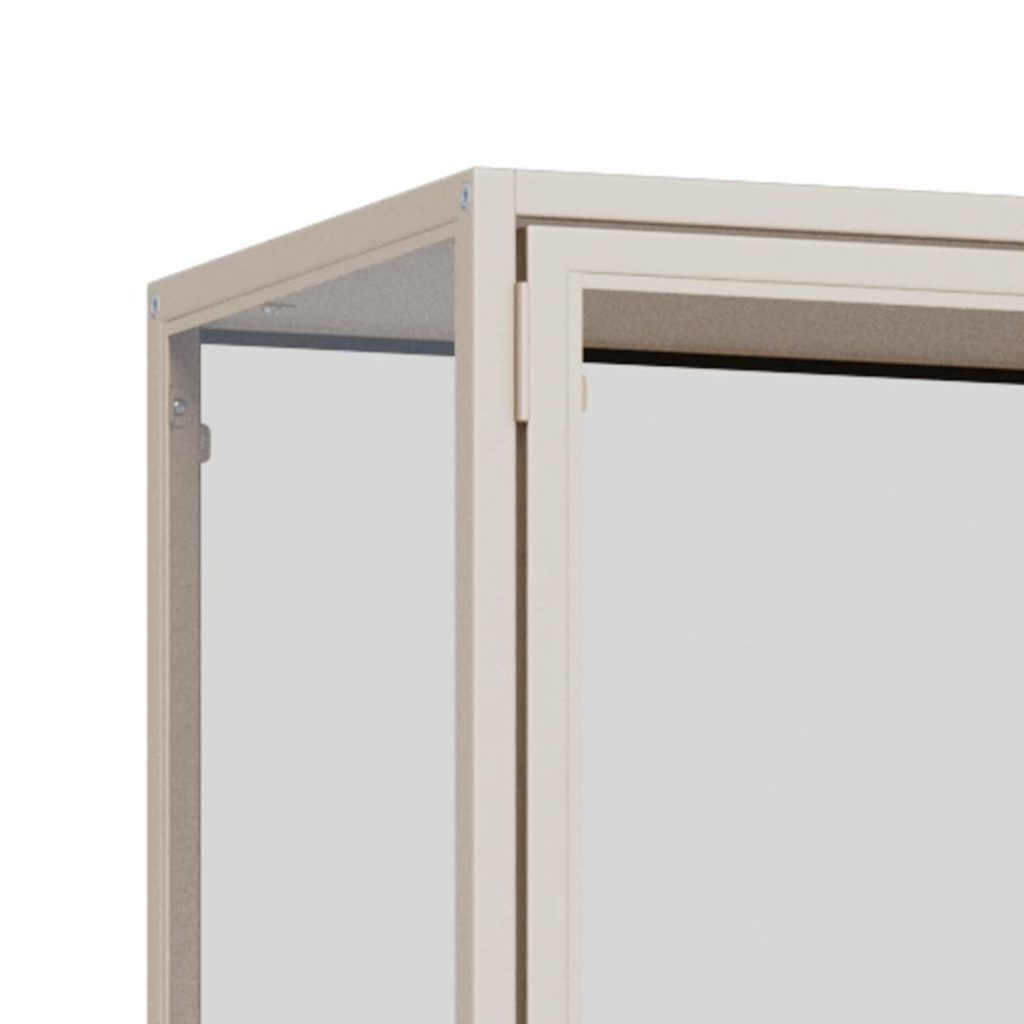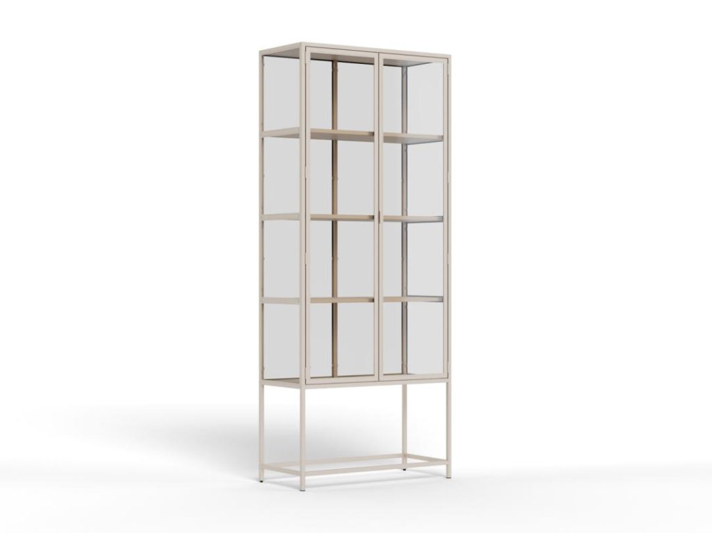Elegante Seaford vitrinekast met grijs stalen frame, melamine planken, stalen deuren met glas en poedercoating. Perfect om je items prachtig te tonen. 77x35x185.6 cm.