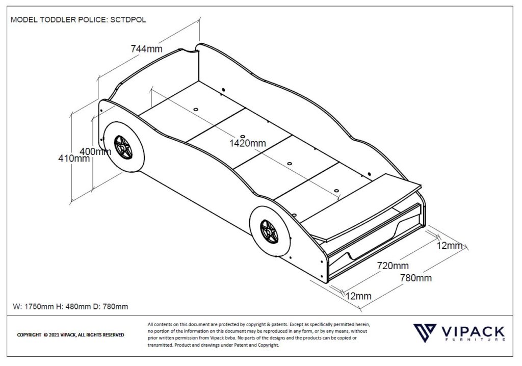 Deze TODDLER POLICE CAR is vervaardigd uit blauw gelakte MDF. De lattenbodem is inclusief en is geschikt voor een matras van 70x140cm.