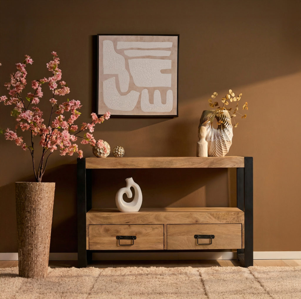 Tv-meubel Britt: handgemaakt van licht mangohout met contrasterend zwart metalen frame en grepen. Twee lades en een open vak, ingelegd met houten stroken voor een eigentijdse uitstraling. Uniek, eenvoudig zelf te monteren. Afmetingen 100×45×60 cm. Onderhoud: lichtvochtig doek.