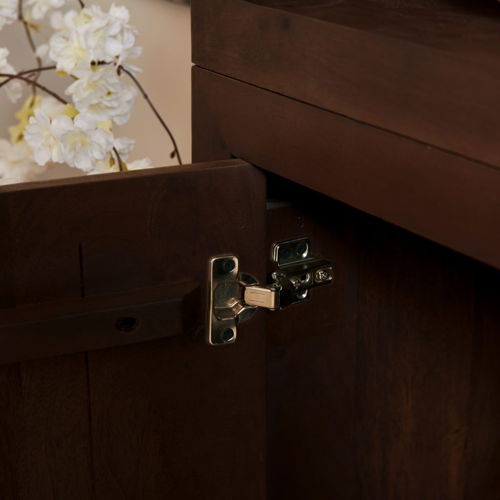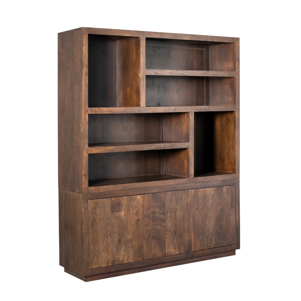 Vakkenkast Brussel Brown XL robuust mangohout met warme bruine finish. Strak, eigentijds design met 6 open vakken en drie greeploze deuren (push-to-open). Royale opbergruimte, 160×45×200 cm. Handgemaakt; kleine onregelmatigheden geven uniek karakter. Onderhoud: afnemen met lichtvochtige doek.