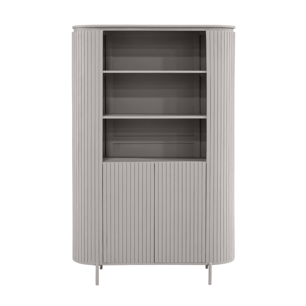 Wandkast Solana — tijdloze, stijlvolle wandkast van mangohout met taupe finish en modern lattenpatroon. Voorzien van twee deuren en drie open vakken voor sierobjecten en persoonlijke spullen. Handgemaakt, uniek; eenvoudige zelfmontage. Perfect te combineren met de Solana-collectie.
