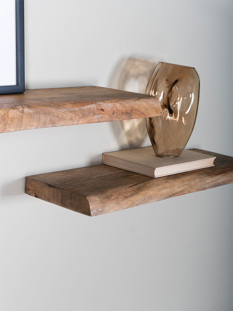 Creëer een unieke wand met deze zwevende wandplank! De wandplank is gemaakt van massief mangohout, en de rand van de plank volgt de natuurlijke vorm van de boom, wat deze wanddecoratie een natuurlijke en pure uitstraling geeft. Vanwege de neutrale kleur van het hout past de wandplank in elk interieur! Afmetingen: 120 x ±20 x 4 cm. Omdat de wandplank van een natuurlijk product is gemaakt, kan de kleur en vorm van het geleverde product afwijken van wat op de afbeelding te zien is. Het draagvermogen hangt af van de montage en de kwaliteit van de muur waarin de plank is bevestigd. Over het algemeen kunnen de wandplanken tussen de 10 en 20 kg dragen, mits ze correct zijn geïnstalleerd met de juiste pluggen en schroeven. Decoreer één of meerdere wandplankjes met persoonlijke spulletjes, vaasjes, beeldjes en andere woonaccessoires voor een persoonlijke touch in de ruimte. De ruwe wandplanken zijn verkrijgbaar in verschillende maten: 40 cm, 60 cm, 80 cm, 100 cm, 120 cm en 140 cm. Ideaal om met elkaar te combineren! Dit product wordt geleverd inclusief blinde schapdrager. Met behulp van de schapdrager kan de plank aan de muur worden opgehangen. Bij installatie op een holle muur of gipswand is het belangrijk om gipspluggen te gebruiken. Deze zijn verkrijgbaar bij uw lokale bouwmarkt. Bij een muur bestaande uit gipsblokken kunnen de meegeleverde pluggen worden gebruikt.