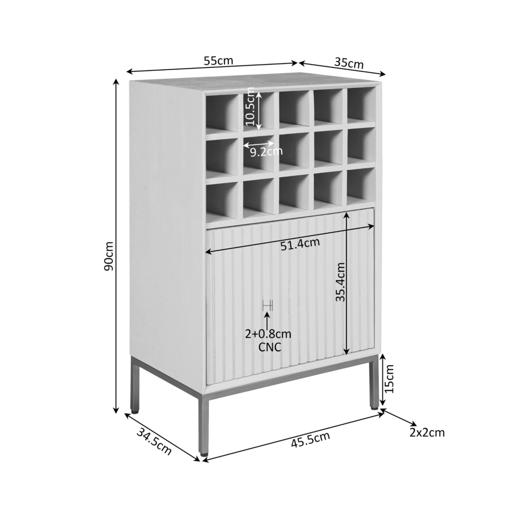 De "Madison" Wine Cabinet is gemaakt van duurzaam mangohout met 15 wijnfleshouders, een opbergvak en stijlvolle verticale latten op deuren voor een moderne look. Afmetingen: 55 cm breed, 35 cm diep, 90 cm hoog. Onderhoud: eenvoudig afnemen met een vochtige doek. Maak je ruimte compleet met deze prachtige toevoeging.