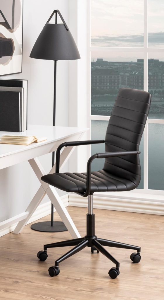Functionele bureau stoel in klassiek ontwerp. Zwart kunstleer met horizontale stiksels, draaibaar, gaslift en 5-sterrenvoet. Eenvoudige montage.