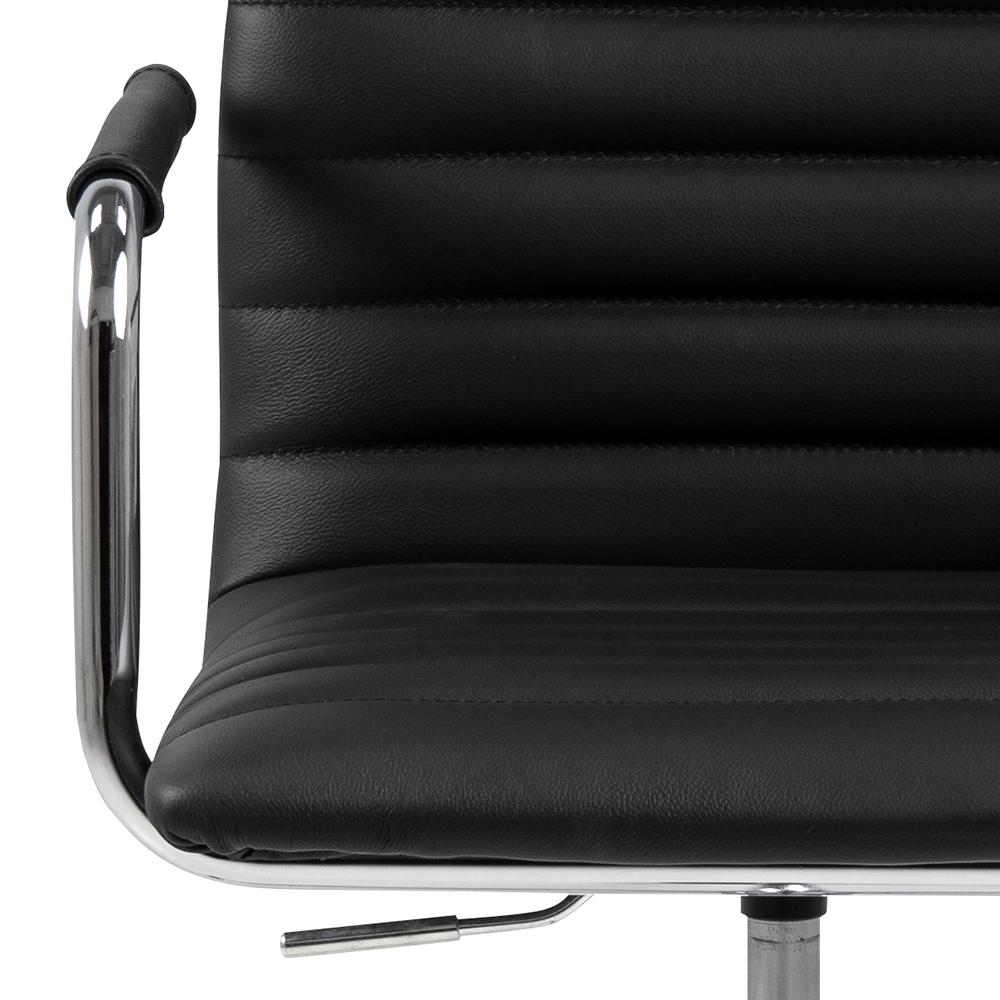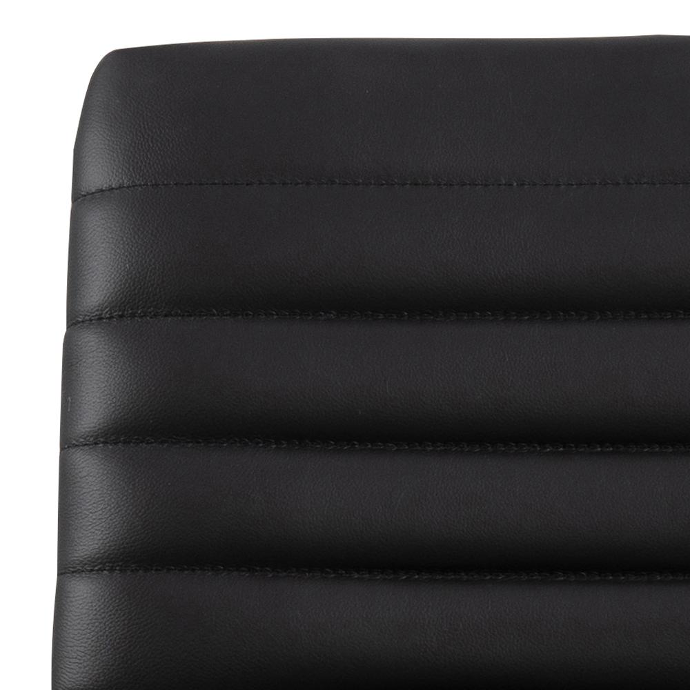 Een klassieke bureaustoel met een elegante stijl en functionaliteit. Met zijn hoge rugleuning, zwarte kunstleren bekleding en horizontale stiksels, is deze stoel perfect voor je kantoor. De zwenkfunctie, gasveer en 5-sterren chromen voet met remwielen zorgen voor comfort en gemak. Ergonomisch en stijlvol.