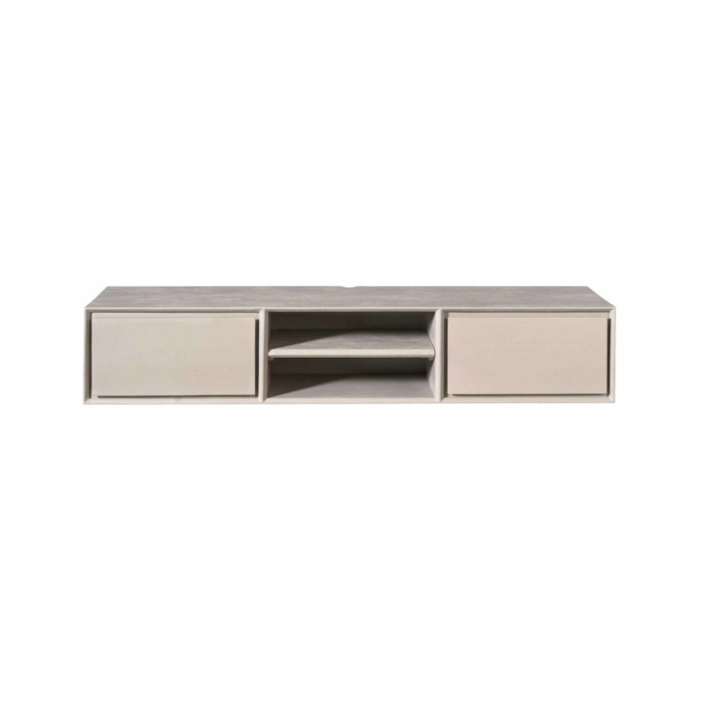 Ambiance Taupe TV-meubel van mangohout: strak zwevend design dat ruimte creëert. Voorzien van twee open vakken en twee greeploze lades. Alleen muurbevestiging, geschikt voor televisies met wandmontage. Afm. 160×35×30 cm. Verkrijgbaar in diverse kleuren/formaten. Onderhoud: afnemen met een lichtvochtige doek.