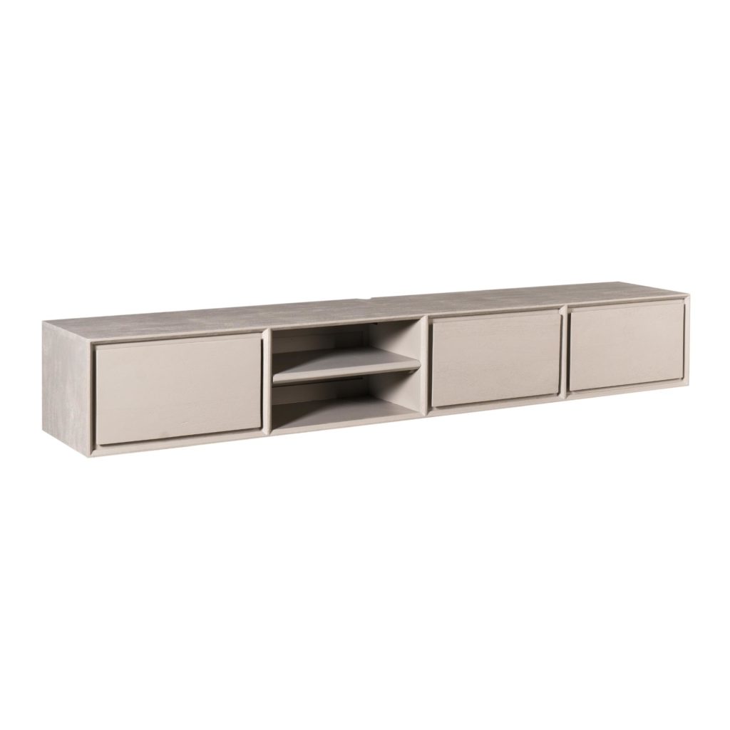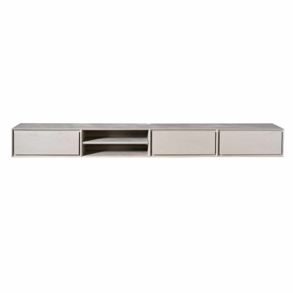 TV-meubel Ambiance Taupe van mangohout — zwevend, stijlvol en ruimte scheppend. Voorzien van twee open vakken en drie greeploze lades. Enkel muurbevestiging; geschikt voor muur‑gemonteerde tv’s. Afmetingen: 200×35×30 cm. Verkrijgbaar in meerdere maten/kleuren. Onderhoud: afnemen met lichtvochtige doek.