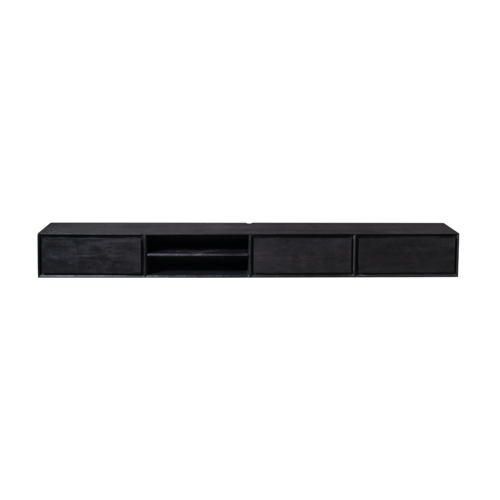 Ambiance Black: zwevend tv-meubel van mangohout. Strak, luchtig design met 2 open vakken en 3 greeploze lades. Verkrijgbaar in diverse maten en kleuren. Alleen voor muurbevestigde tv’s (wordt aan de muur gemonteerd). Afm. 280×35×30 cm. Reiniging: afnemen met lichtvochtige doek.