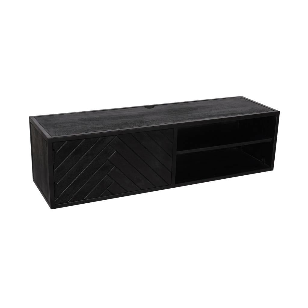 Dit elegante zwevende TV-meubel van mangohout met zwarte lak en visgraatpatroon biedt stijlvolle opbergoplossingen. Dit meubelstuk combineert elegantie en functionaliteit perfect. Ideaal voor moderne woonkamers. Afmetingen: 120 cm breed, 35 cm diep, 33 cm hoog. Onderhoud: Afnemen met een lichtvochtige doek.