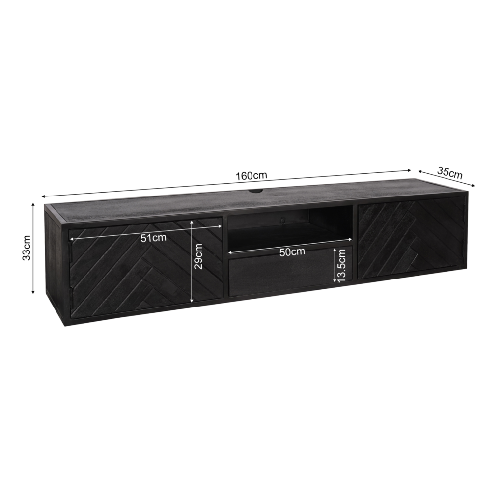 Dit trendy zwevende tv-meubel is vervaardigd uit gezandstraald mangohout met een moderne zwarte lak. Het unieke visgraatpatroon aan de voorkant voegt een verfijnde uitstraling toe. Perfect voor het opbergen en tonen van spullen in stijl. Ideaal voor een strakke en moderne woonkamer!
