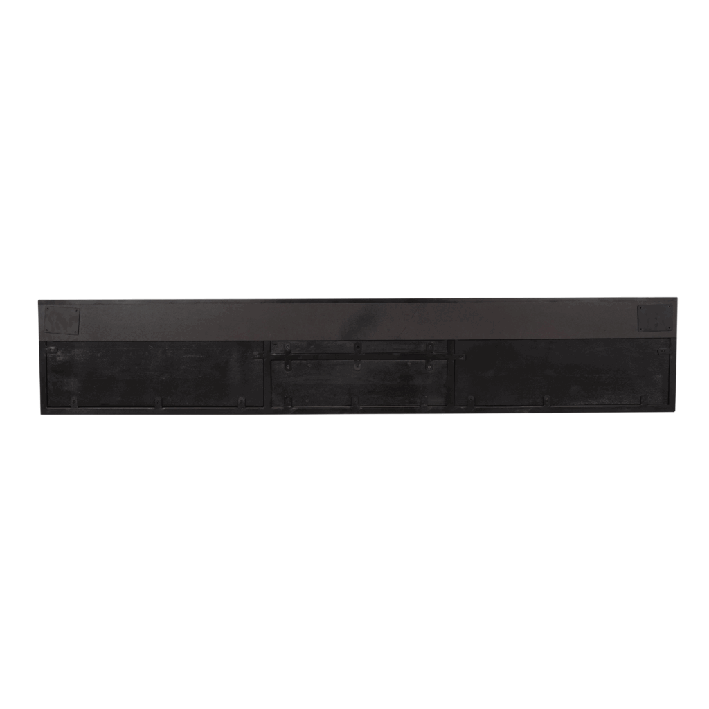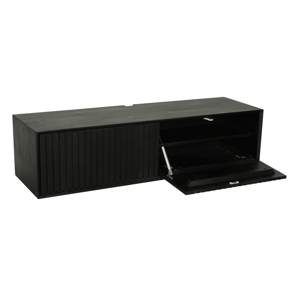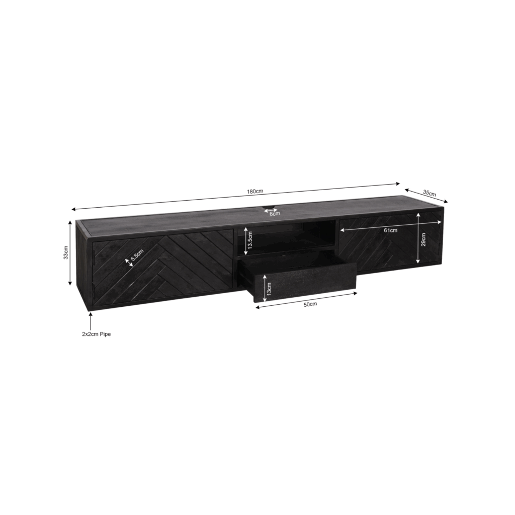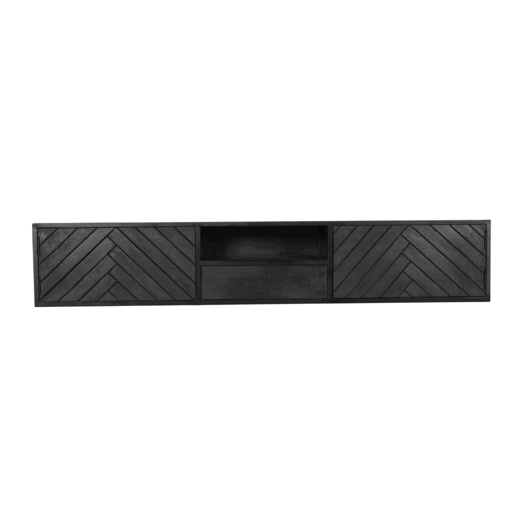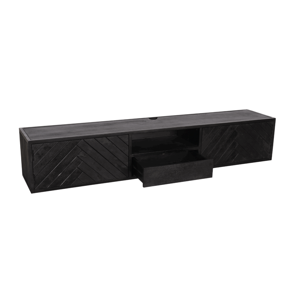 Deze stijlvolle zwevende TV-kast van mangohout met modern zwart lakwerk en visgraatpatroon voegt een verfijnde touch toe aan elke woonkamer. Praktisch opbergen en tentoonstellen wordt moeiteloos dankzij het open vak. Een perfecte mix van elegantie en functionaliteit. Onderhoud: afnemen met lichtvochtige doek.