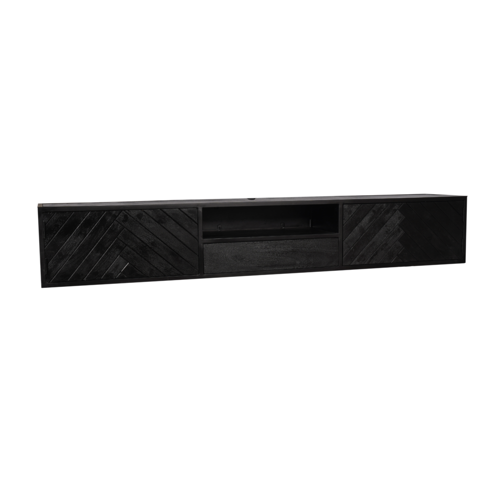 Dit elegante zwevende TV-meubel is vervaardigd uit gezandstraald mangohout met een moderne zwarte lak. De unieke visgraatpatroon voegt verfijning toe, terwijl het open vak praktisch en stijlvol is voor opslag en display. Ideale combinatie van elegantie en functionaliteit voor een moderne woonkamer! Afmetingen: B200 cm x D35 cm x H33 cm. Onderhoud: Afnemen met een vochtige doek.